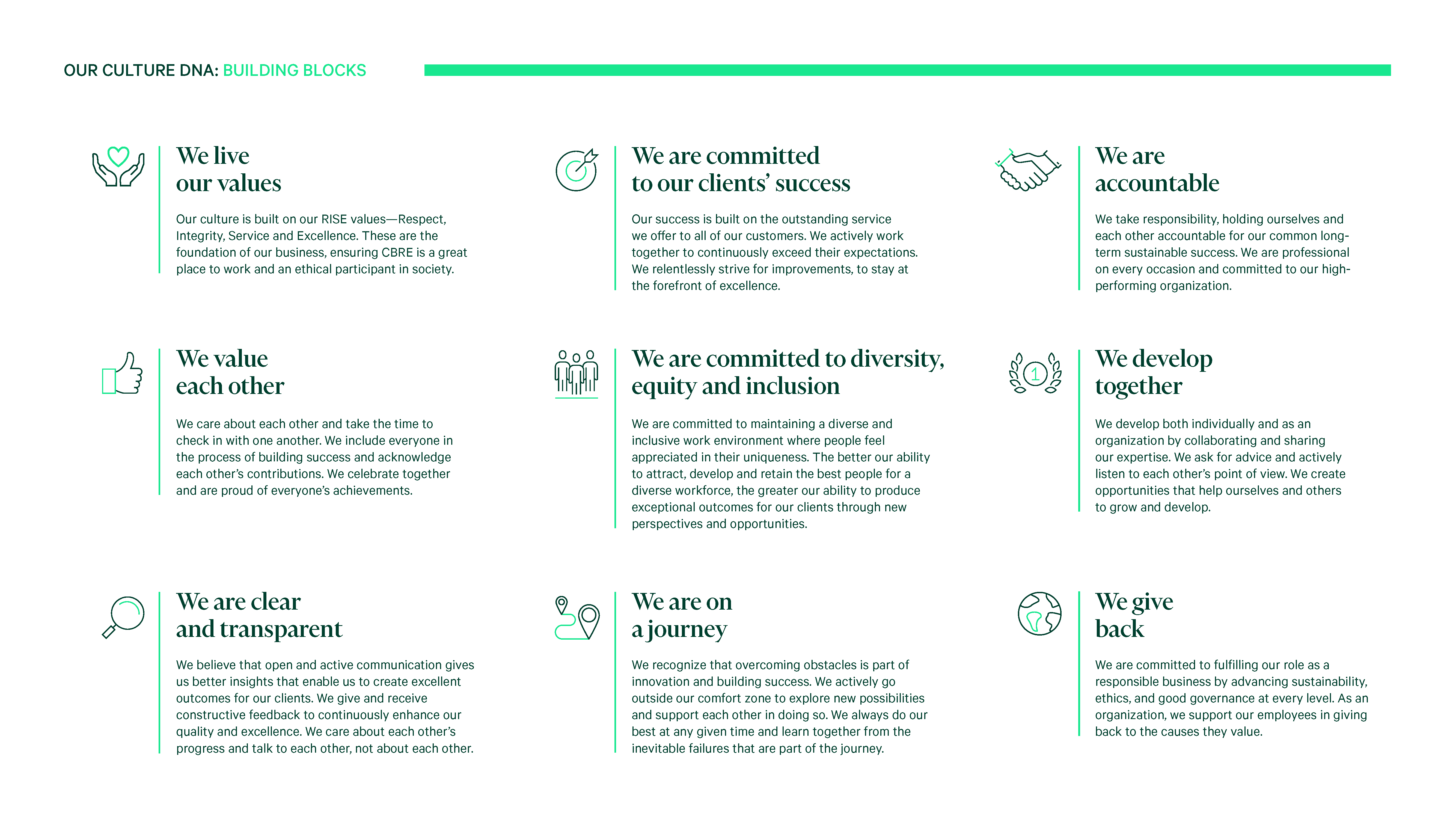 One of the world's largest commercial real estate services companies, CBRE operates across dozens of markets and thousands of employees, with a culture that had grown complex enough to need a clear articulation of what it actually stood for.