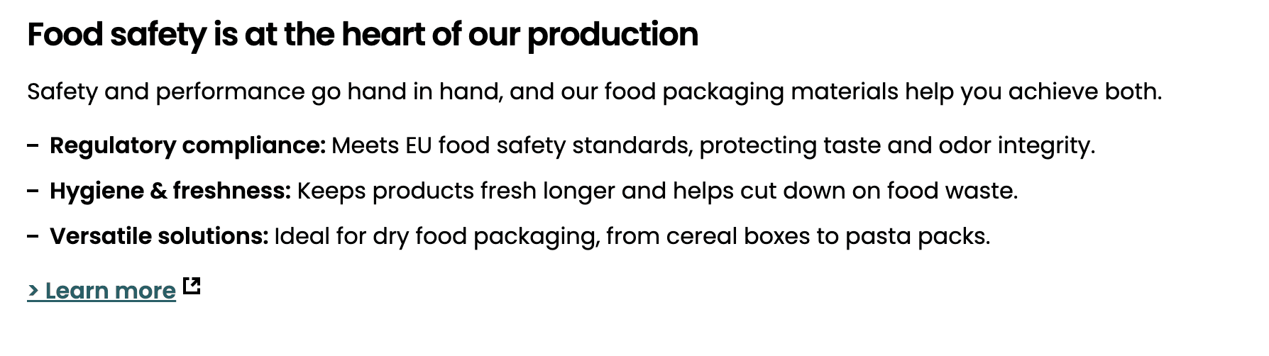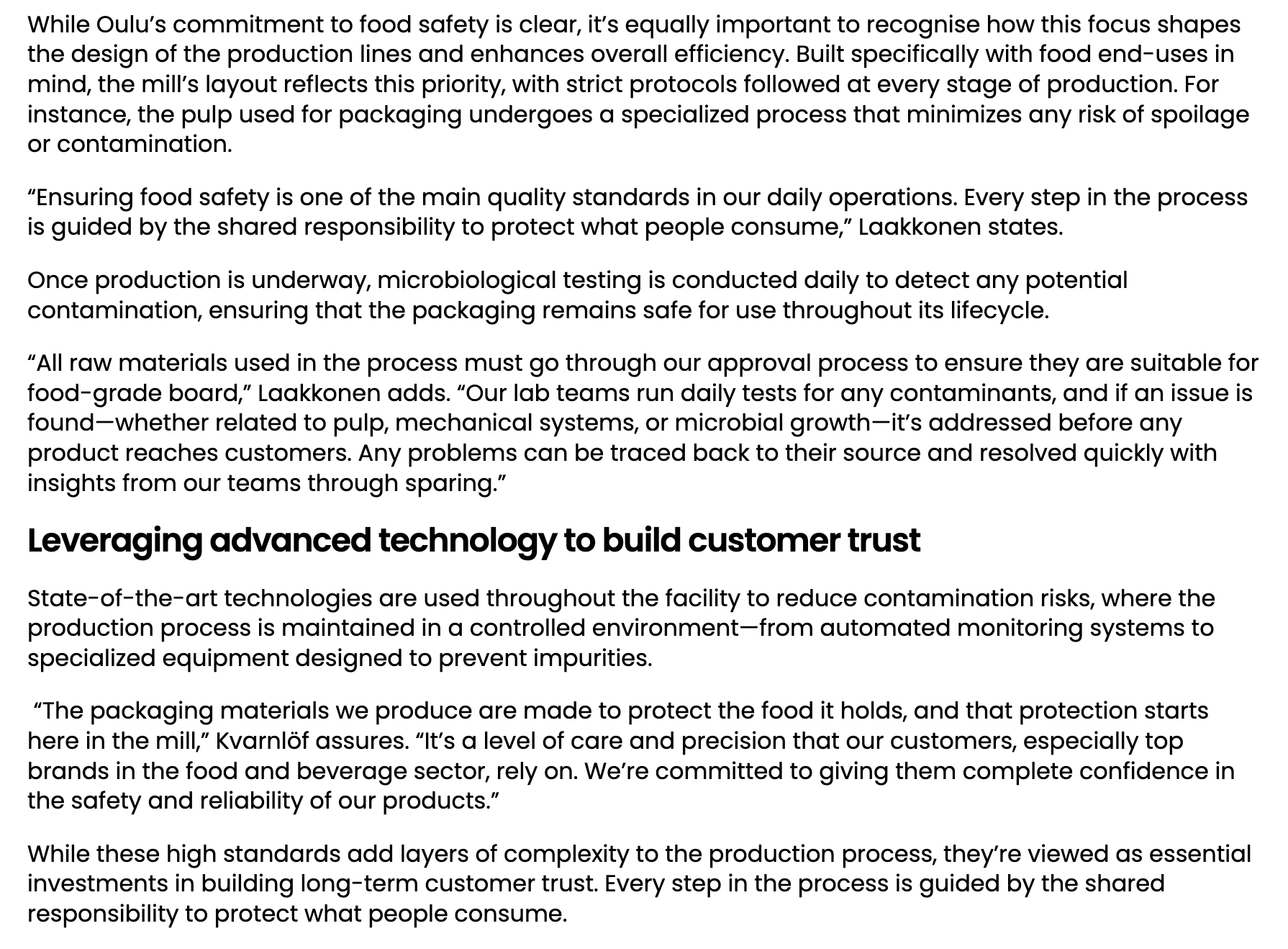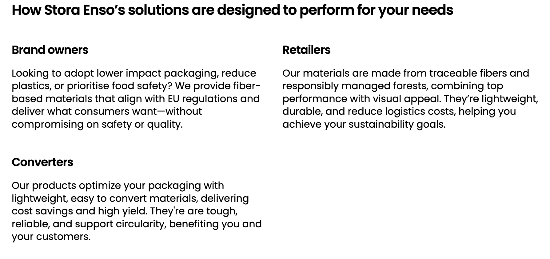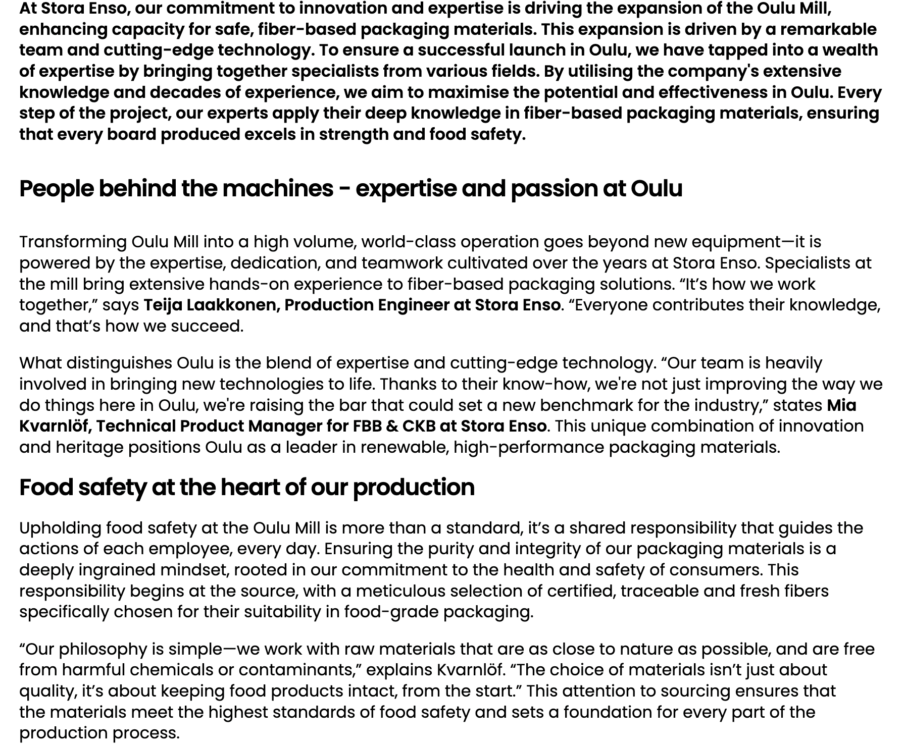 As lead copywriter and editorial strategist on the content programme built around the launch, my work focused on communicating what that capacity meant in practice. A series of product pages across six end-use categories: dry food, frozen and chilled, chocolate and confectionery, beverages, and personal care, translated the mill’s expanded offering into language that felt clear, credible, and commercially relevant for brand owners, retailers, and converters looking to move away from plastic. Alongside this, the Oulu article brought a human dimension to the expansion, the people, the expertise, and the culture of food safety that make the production possible. Together, the work formed a coherent story: that this was not just a milestone for Stora Enso, but a meaningful opportunity for the customers it serves.