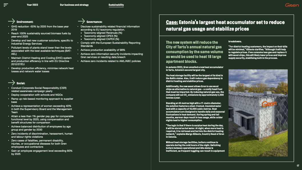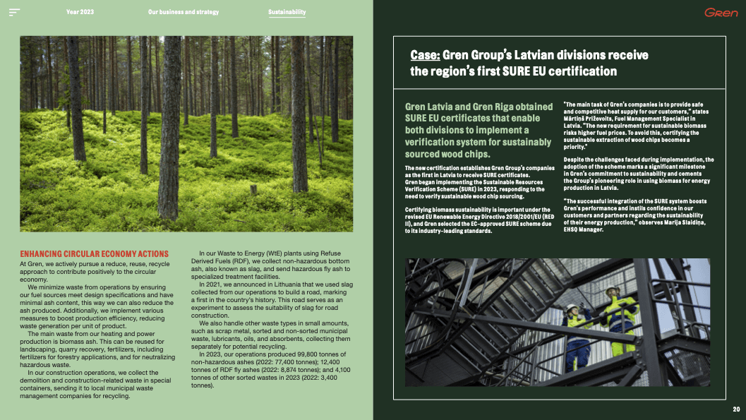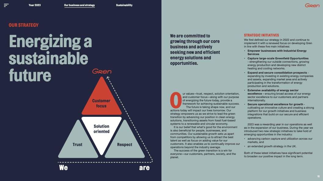 For their first ESG report, a team was brought in to establish the editorial foundation from the ground up. That meant more than writing, it meant making decisions about tone, perspective and structure that would shape how Gren chose to present itself to the world for years to come. I focused on the report's most substantive editorial pieces, researching and writing the case studies that illustrated Gren's work in practice, and translating the company's strategic initiatives into language that was clear, credible, and grounded.